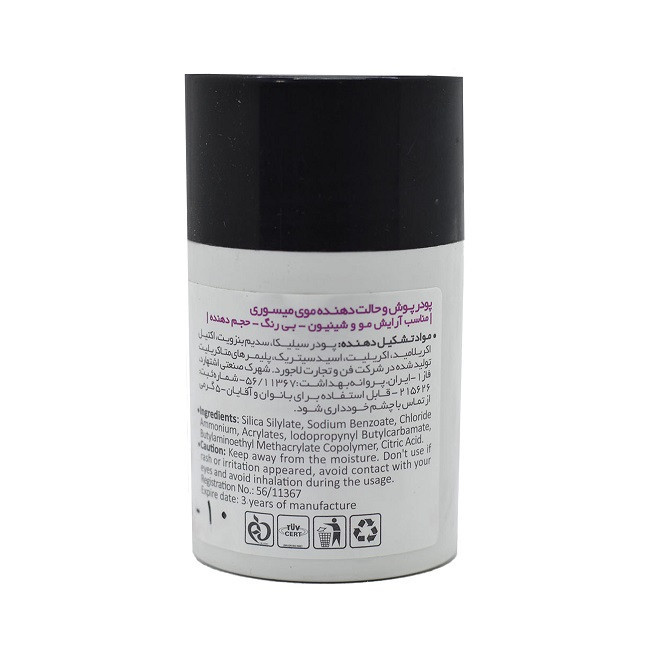 پودر پوش دهنده ،پرپشت کننده و حالت دهنده موی میسوری مناسب برای شینیون میباشد.دارای ماندگاری بالا برای انواع مو حتی موهای نازک میباشد .قابل استفاده برای خانمها و آقایان است و ایجاد چربی نمیکند وبه براق شدن مو کمک میکند.